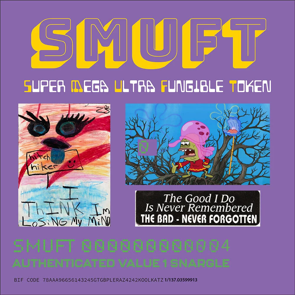 #SMUFT are the punk, trashy, lo-fi, cool, hyper-creative, accessible-to-anyone, easy-to-make, easy-to-collect, strange, weird, Merry Prankster, energy friendly-ish, underground, indie counter-culture of that whole strange blockchain NFT thing going on. #SMUFT is a cold pizza in the morning. It is a pigeon in a parking lot at 6:01 am in the morning in NYC. It is a subway artist in Tokyo doing something cool. It is your first guitar. It is orange soda and fries. It is always a bean and cheese burrito. A #SMUFT has a value of 1 SNARGLE, which is currently within a $0.00 to $0.99 range (or a bean and cheese burrito). Be free and make a #SMUFT. We are the un-NFT.